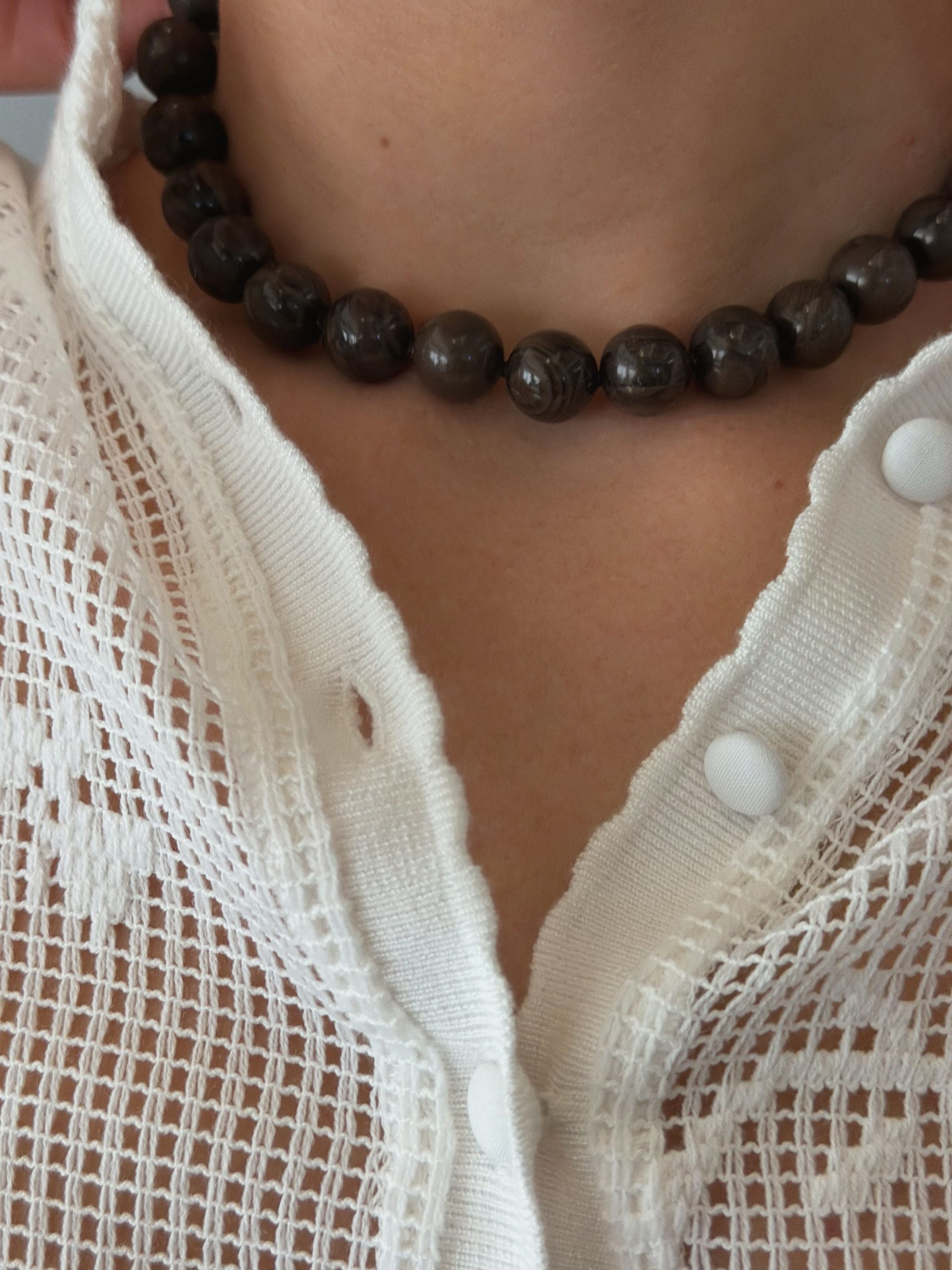 A sculptural necklace made with 12mm beads. Easy to layer or wear on its own, finished with 18k gold plated stainless steel hardware.