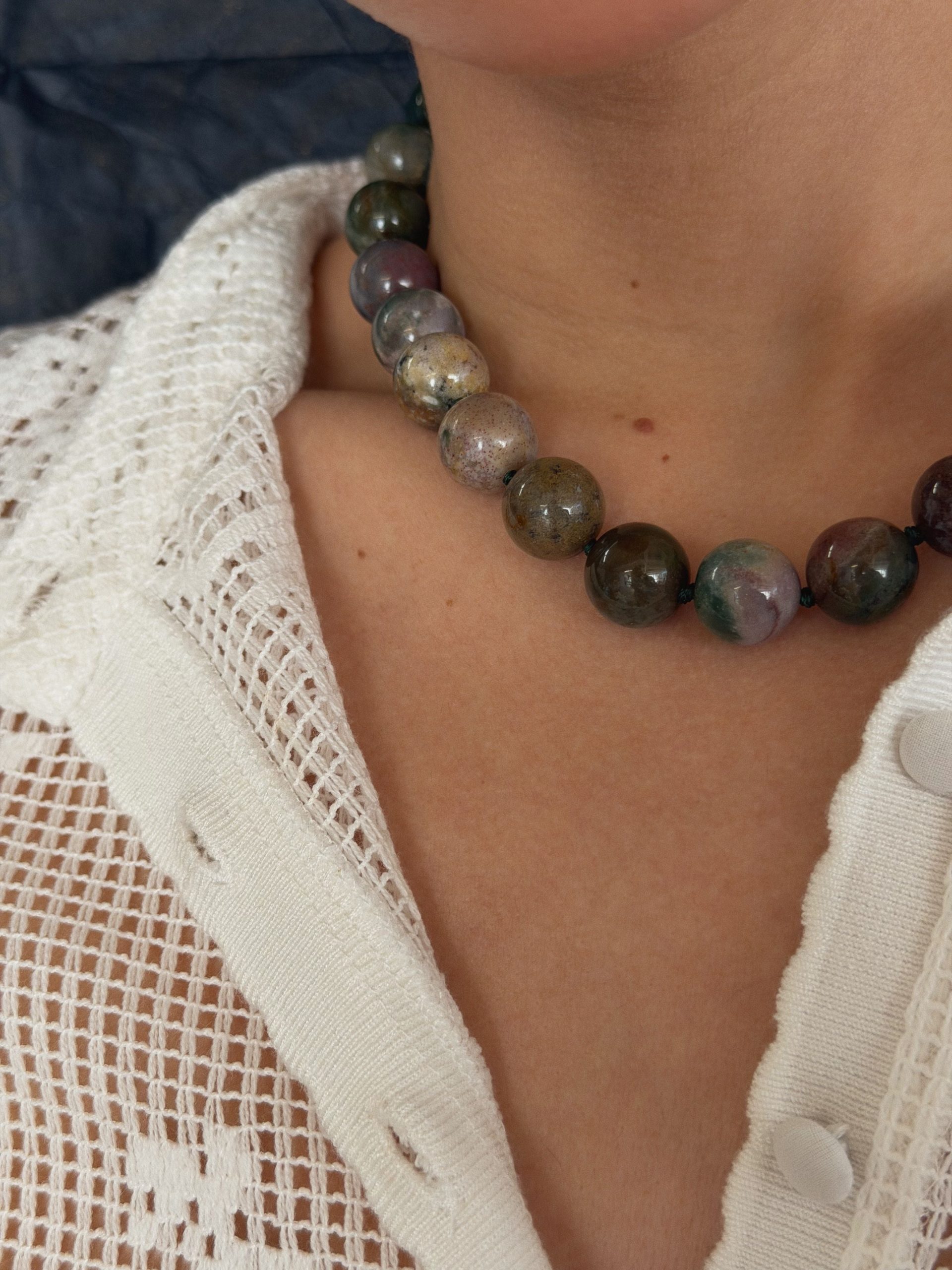 A chunky necklace made with 14mm beads for a soft statement. Hand strung and finished with our 18k gold plated stainless steel hardware.