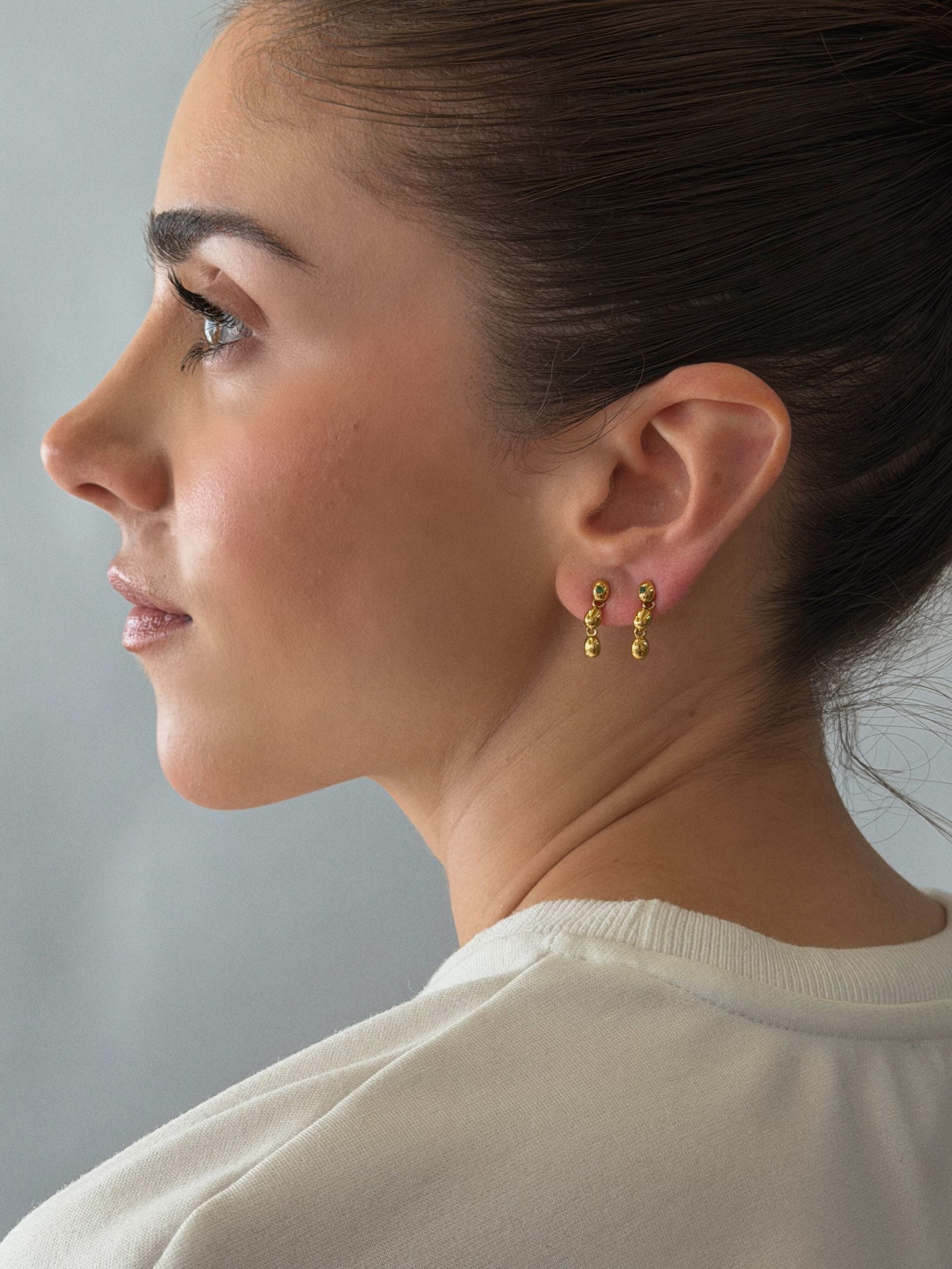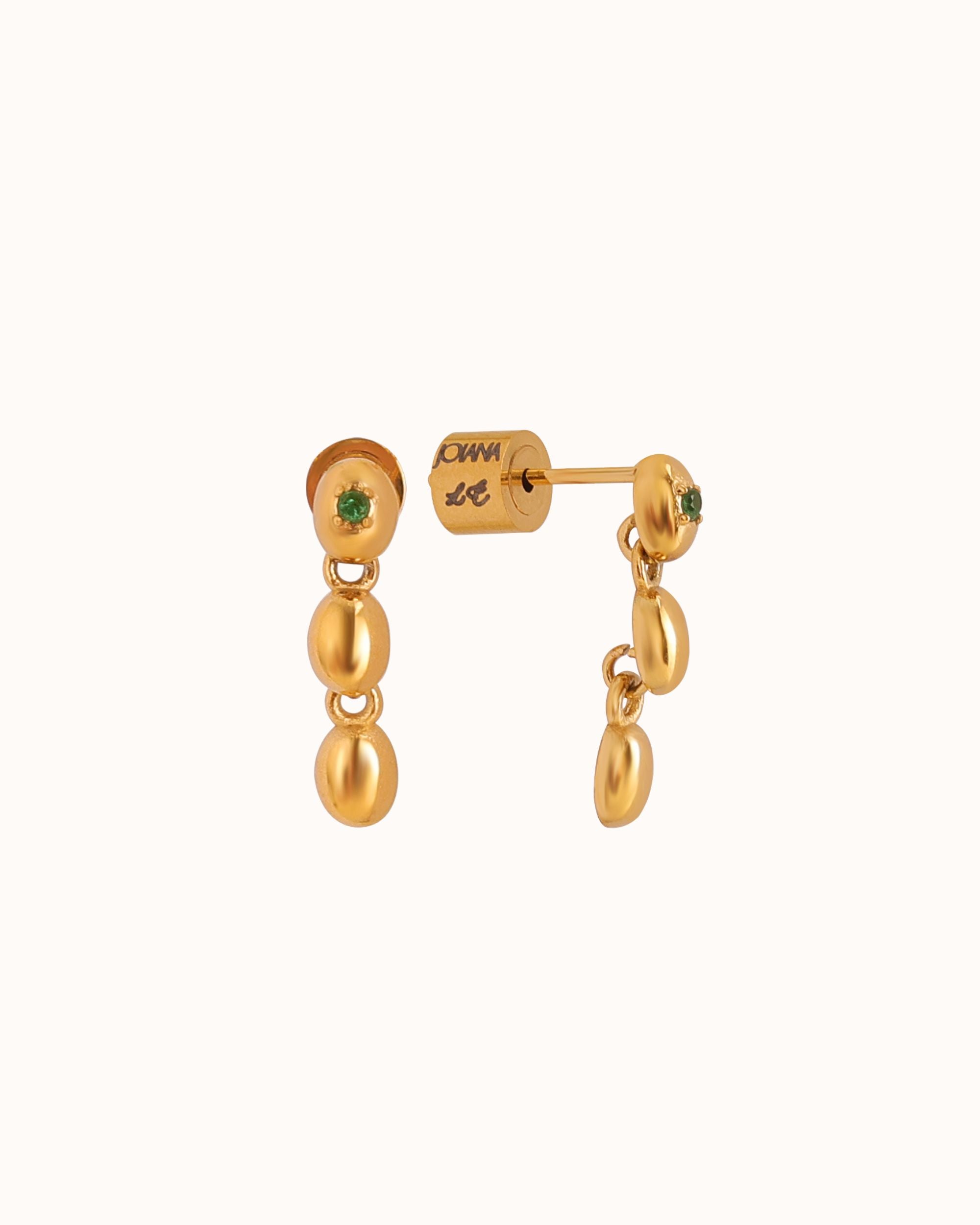 These mini dusters feature three olive-shaped drops per ear, designed to sway with just the right amount of movement. At the top: a single olive with a 4-prong set emerald — the signature mark of this capsule collection.