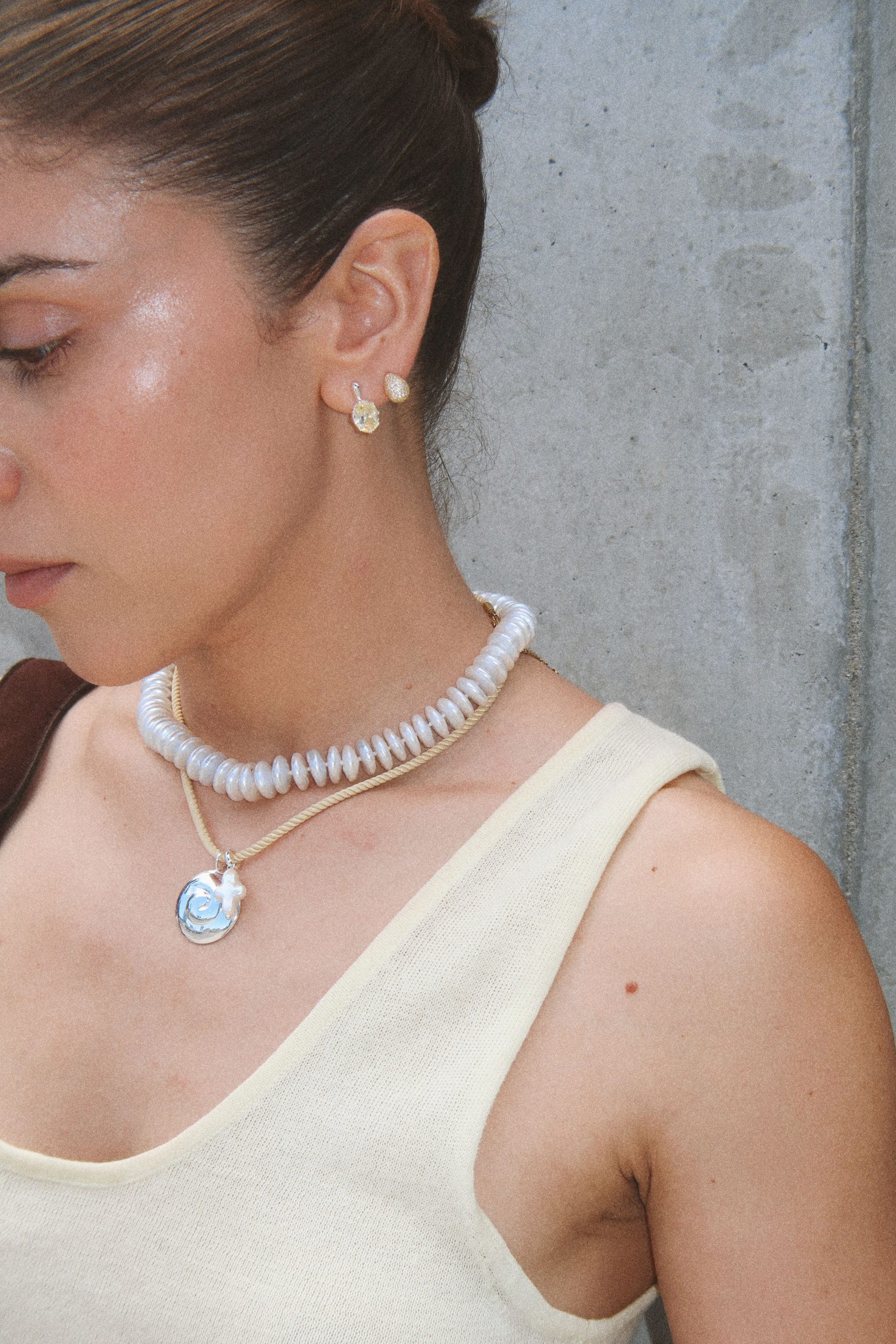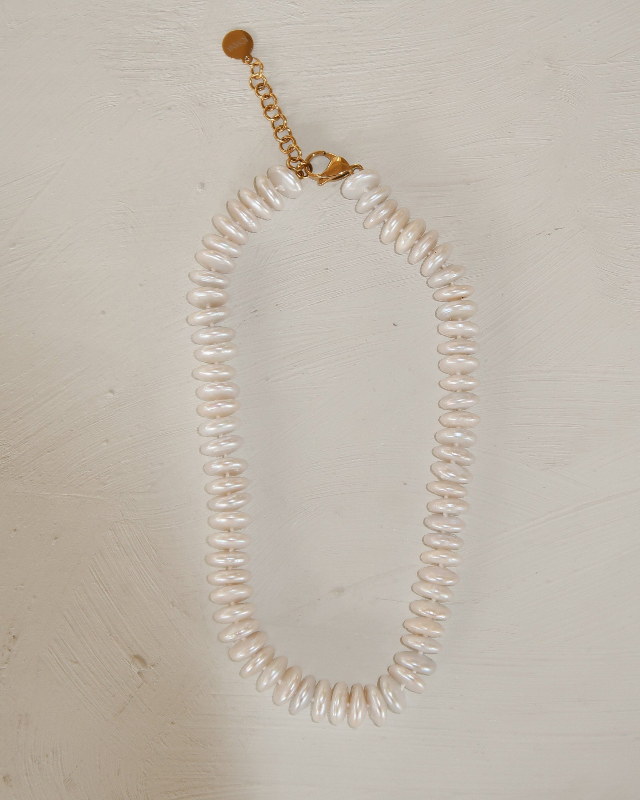 The Rondelle Pearl Necklace is strung with smooth freshwater rondelles for a soft glow and a light, comfortable fit. Wear it solo or stack it with your everyday pieces.
