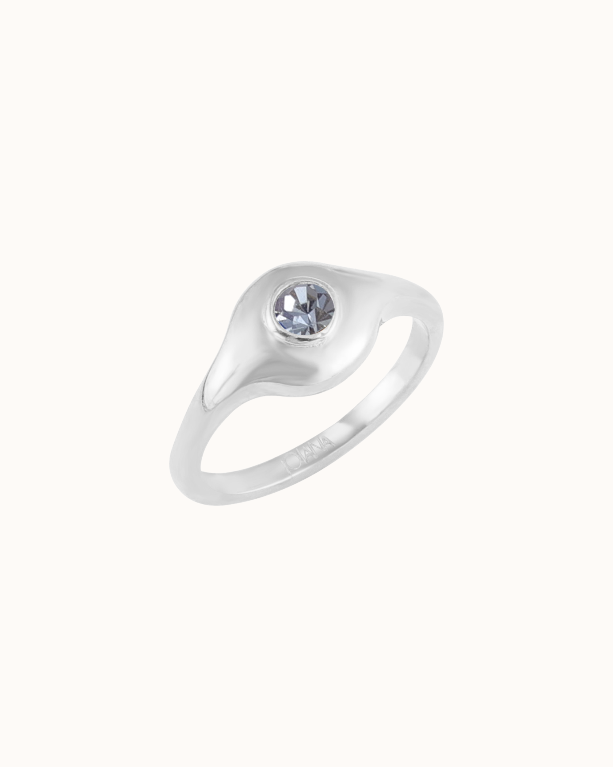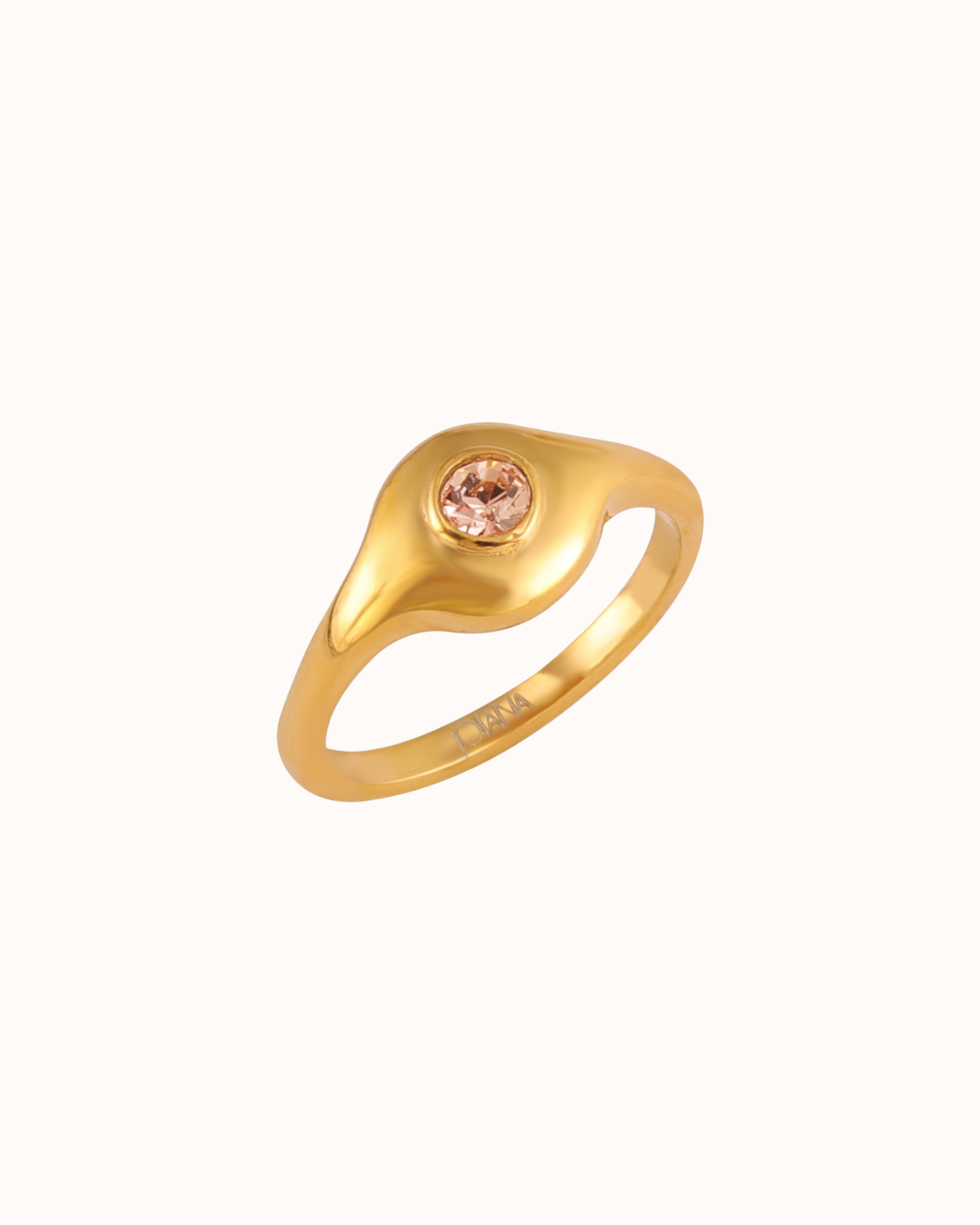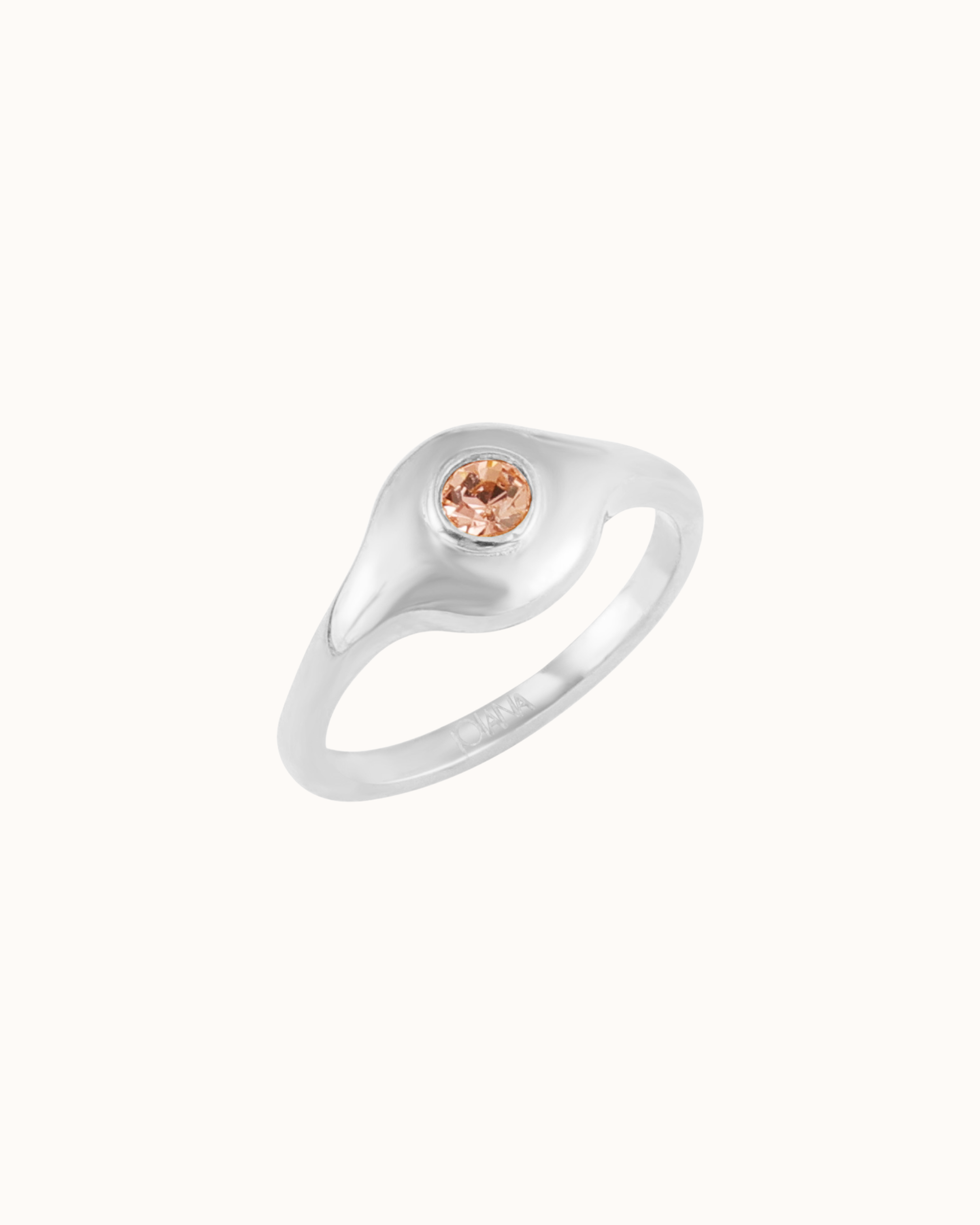 Irregular round signet ring, designed in smaller sizes to wear on your pinky. Two stone options, light sapphire and rose zirconia.
